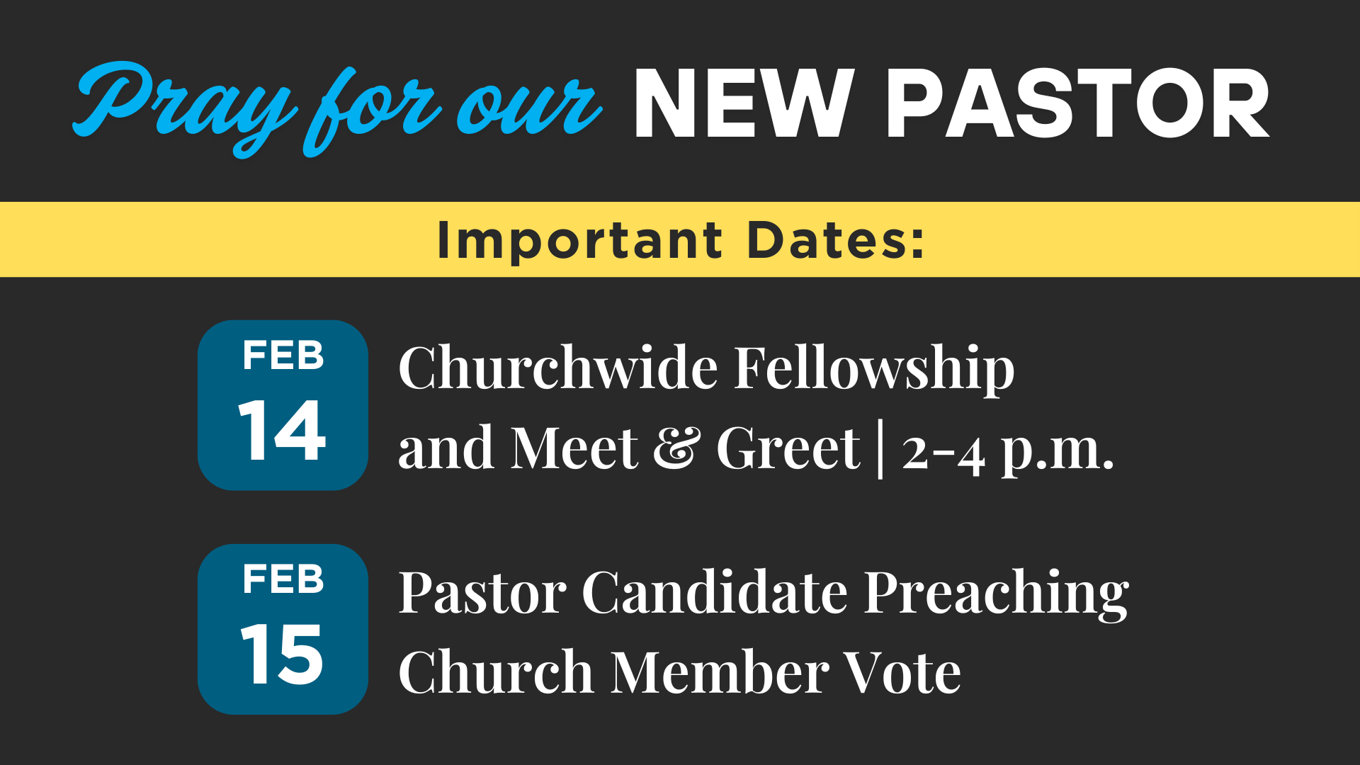 Join us from 2-4 p.m. on Saturday, February 14th, for a Meet & Greet with the new pastor candidate and his family. There will be snack refreshments provided.